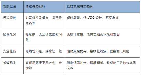 低硅氧烷导热垫片凭借精准适配的产品特性,成为充电宝散热的优选方案。相较于传统导热材料,其核心优势体现在四大维度: